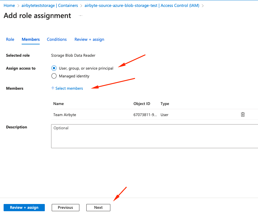 User, Group, or service principal, click onmembersand select member(s) so they appear in table and clickNext